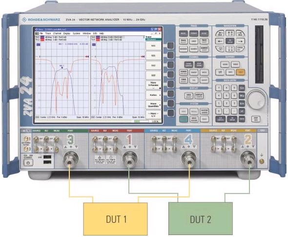 R&S?ZVA 的發(fā)生器設(shè)計,使得每個測試端口都可以同時作為信號源和接收機使用。 因此,可以對測試端口進行分組。 在各個測試端口組上進行的測量任務(wù)可以彼此實現(xiàn)同步。 因而,可以并行地測量多個 DUT 或者一個 DUT 的多個通路; 測量時間僅相當(dāng)于測量一個設(shè)備所需要的時間。 因此,同時測量兩個兩端口DUT時,速度將提高一倍;同時測量四個單端口DUT時,速度將是原先的四倍。