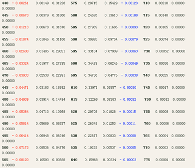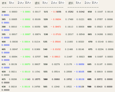 通過這一段分析可以看出,從546.1nm到690nm這一段,b的數(shù)量是由0開始增加,之后又減少,到了690nm處的時(shí)候減少到0。顯然b在這區(qū)間內(nèi)肯定要有一個(gè)*大值?,F(xiàn)在,我們來看一下“光譜三刺激值”表中的546.1nm到690nm這一段,其中起輔助作用的光的“藍(lán)原色”的數(shù)量的變化(即,藍(lán)色三刺激值的變化),不*是這樣的一種情形嗎?它有一個(gè)*大值*發(fā)生在545nm處,數(shù)值的大小是0.00138(在表中我們對(duì)這個(gè)*大值中的138標(biāo)了黑色,目的為了便于重新查找它。至于這個(gè)“刺激值”的負(fù)號(hào)來源,也*無需再作解釋了)。