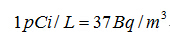 氡的濃度一般使用放射性活度單位,因此可以在各種檢測(cè)報(bào)告上看到測(cè)量結(jié)果為Bq/m3(貝克勒爾/立方米)或pCi/L(皮居里/升)。其中貝克勒爾為國(guó)際單位制單位,這兩個(gè)單位可以簡(jiǎn)單地由下式轉(zhuǎn)換: