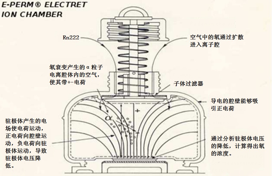 氡在離子腔中發(fā)生阿爾法衰變,阿爾法粒子攜帶能量,將空氣電離帶正負(fù)電荷。駐極體帶有700-780V電壓,在離子腔中形成電場(chǎng),正負(fù)電荷在電場(chǎng)中運(yùn)動(dòng)。正電荷接觸導(dǎo)電腔壁,被導(dǎo)出儀器。負(fù)電荷接觸駐極體,使駐極體電壓降低。使用電壓讀數(shù)器讀取駐極體電壓,通過(guò)電壓降低的多少和測(cè)量時(shí)間計(jì)算氡濃度。