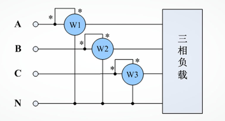 2、 三相四線制,由于無法判斷三相負載是否平衡或是否在中性線上有零序電流產(chǎn)生,只能采用三瓦計法;
