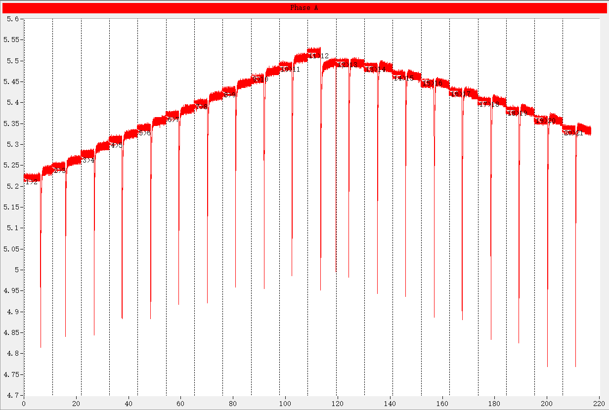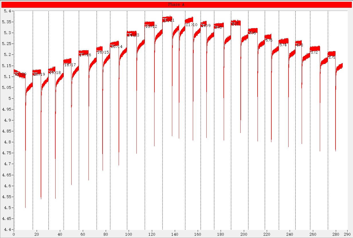 21-1檔位過渡時(shí)間和線性度;記錄間隔0.1ms,測(cè)試電流15A。