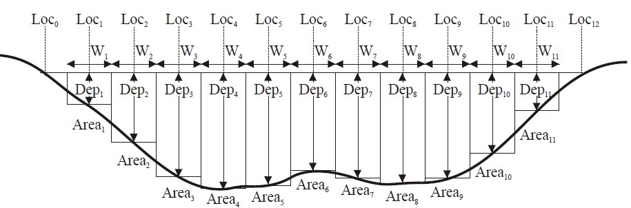 中間值法首先將河道分為等距的段落,圖示為W1-W11。使用流速計在每個段落的中心位置測量流速,流速測量方法根據(jù)上面的建議選擇。依次測量完11個段落進行計算。表示為公式如下所示: