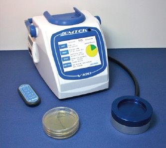 V100通過線纜給旋轉(zhuǎn)裂縫式、封閉環(huán)境式采樣器(R2S和RCG)的電動(dòng)機(jī)供電,在采樣過程中電動(dòng)機(jī)會帶動(dòng)培養(yǎng)皿旋轉(zhuǎn),從而使通過裂縫的微生物均勻的分布在培養(yǎng)皿上。因?yàn)榕囵B(yǎng)皿的旋轉(zhuǎn)速度是恒定的,所以用戶不但可以獲得均勻的樣品,也可以通過不同位置的菌落數(shù)量判斷微生物隨時(shí)間變化的情況。例如,采樣時(shí)間設(shè)定為360秒,R2S采樣器每秒旋轉(zhuǎn)1°,采樣完畢時(shí)培養(yǎng)皿旋轉(zhuǎn)一圈。如果在90°的位置發(fā)現(xiàn)菌落過多,則說明在第90秒時(shí)空氣中的微生物含量較高。